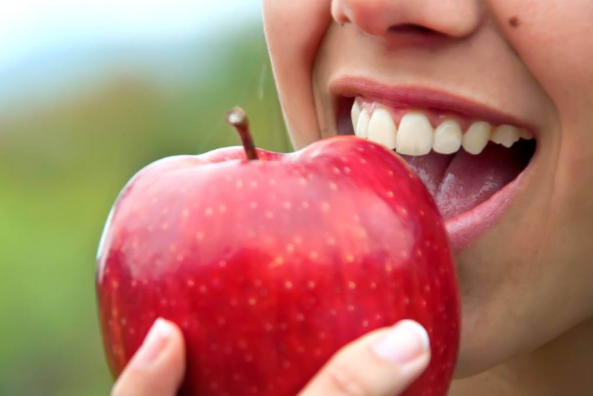 A mastigação de maçãs estimula a produção de saliva, o que reduz os níveis de bactérias na boca e previne cáries.