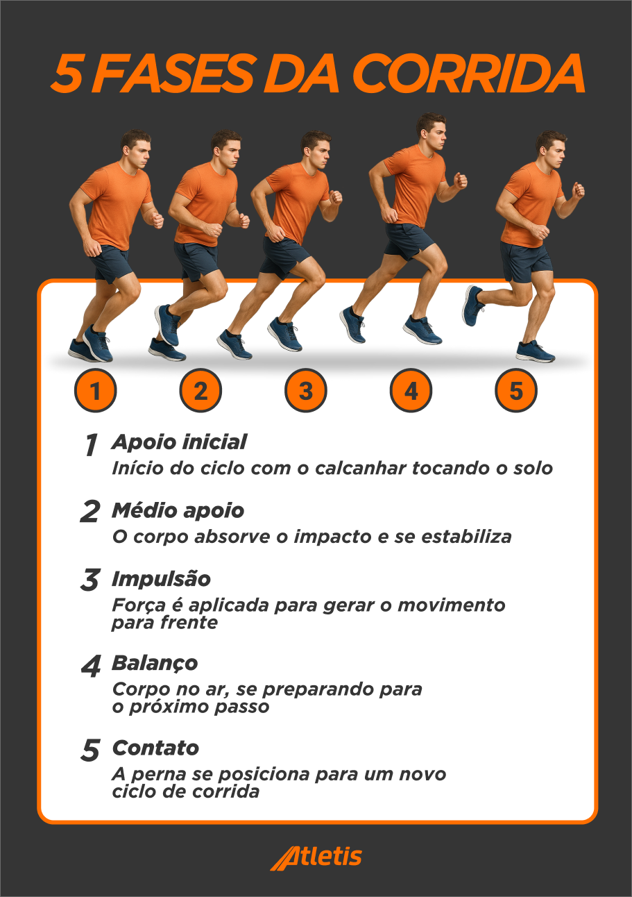 A corrida se divide em cinco fases biomecânicas, cada uma com impacto direto na eficiência do movimento e na redução do desgaste físico: